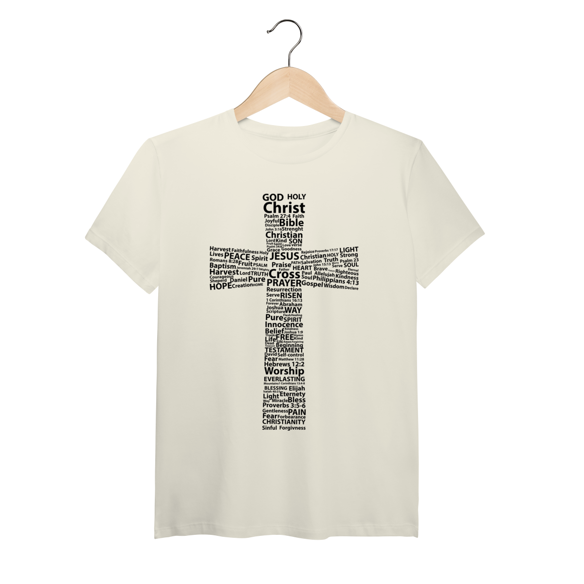 Uma composição densa e minimalista onde dezenas de referências bíblicas e atributos de Deus formam a imagem da cruz, criando uma peça que é pura literatura visual. O fundo branco destaca a tipografia preta, enquanto a fibra de Algodão Pima entrega a suavidade de uma peça de luxo com alta resistência. Ideal para quem busca um visual clean, mas carregado de significado e conteúdo bíblico.