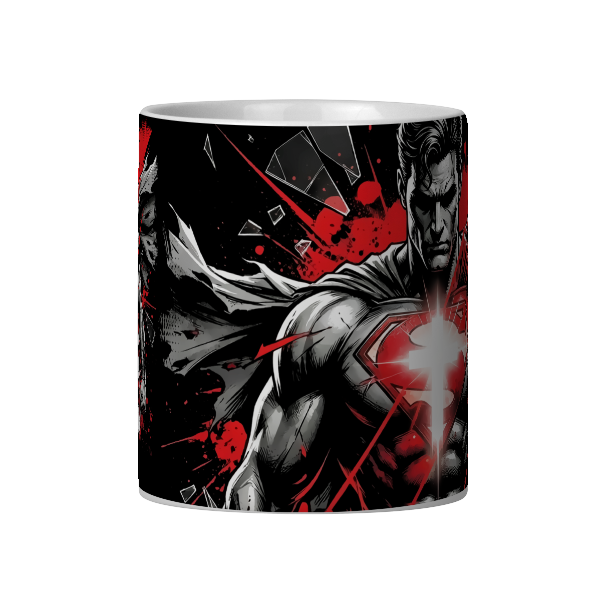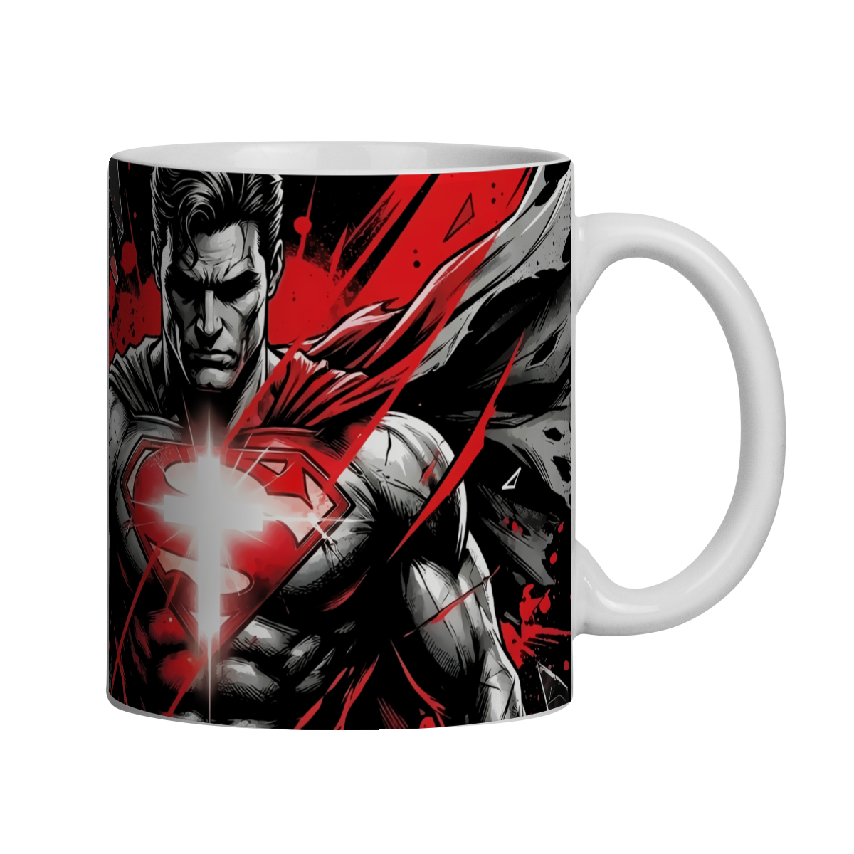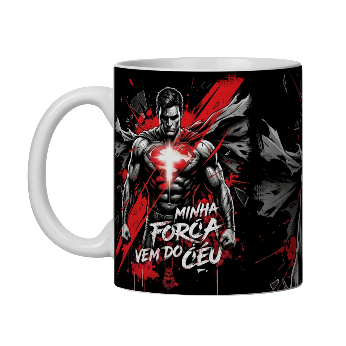 Esta caneca apresenta uma arte imponente em estilo "trash polka", destacando a figura do herói cuja verdadeira energia emana de uma cruz central iluminada. Com um contraste vibrante entre preto e vermelho, a peça transforma o café da manhã em um momento de afirmação: "Minha força vem do céu". Produzida em cerâmica de alta qualidade, é o item indispensável para quem deseja começar o dia com coragem, estilo e propósito.