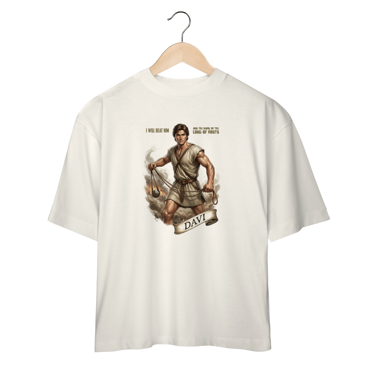 Esta estampa monumental captura a jornada de fé de Davi, apresentando na frente a preparação com a funda e nas costas o triunfo épico sobre o gigante sob a autoridade do Senhor dos Exércitos. O design utiliza uma estética cinematográfica rica em detalhes para narrar a vitória do improvável sobre o impossível, transformando o "simples pastor" em um símbolo eterno de coragem espiritual. Ideal para quem busca uma peça unissex com forte impacto visual e profundidade bíblica, esta criação é um manifesto de que nenhum gigante é páreo para quem caminha em Nome do Senhor.